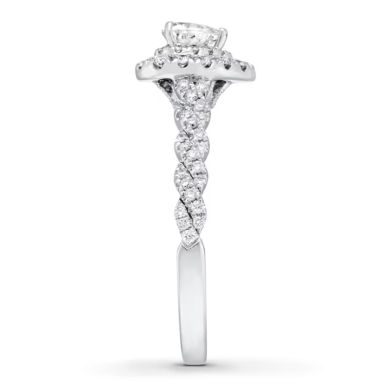 A gorgeous symbol of your love, this sparkling bridal; features an engagement ring with a romantic heart-shaped diamond haloed by glimmering round diamonds. The band and matching wedding ring are adorned with twists of round diamonds, bringing the total weight of the set to 7/8 carat. The ring is styled in 14K white gold.
