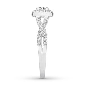 This stunning engagement ring effortlessly combines romantic and modern styles for a design they will love. Round diamonds halo a sparkling diamond in the center, while graceful twists of diamonds form the band. The 14K white gold ring has a total diamond weight of 5/8 carat.