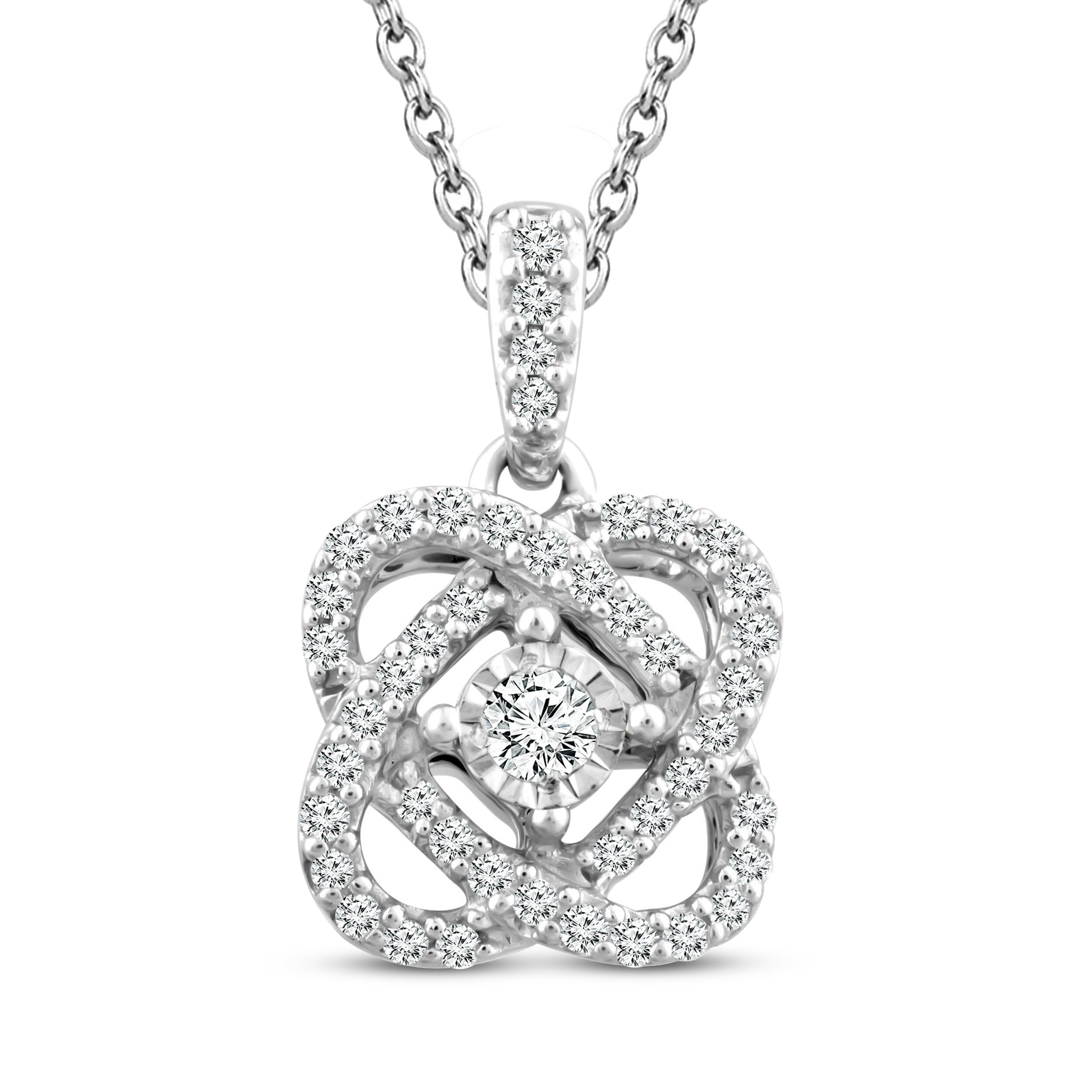 This enchanting diamond necklace serves as a beautiful reminder that through life's twists and turns, love keeps you centered. Featuring a stunning round center diamond and surrounded by an interwoven swirling design of diamonds, the pendant has a total diamond weight of 1/10 carat. The pendant is crafted of sterling silver and hangs on an 18-inch cable chain that secures with a spring ring clasp.