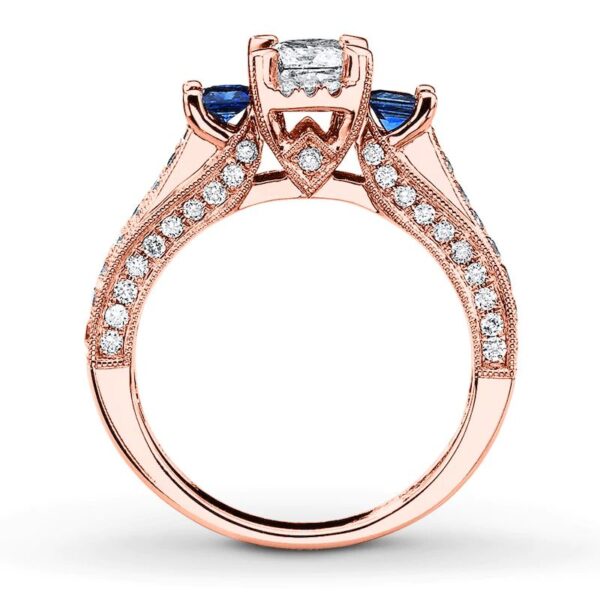 A princess-cut diamond is framed by round diamonds in the sparkling center of this gorgeous engagement ring. A square-cut natural sapphire adds color to each side of the center to complement. Round diamonds shimmer along the 14K rose gold band and profile, bringing the total diamond weight to 1 carat.