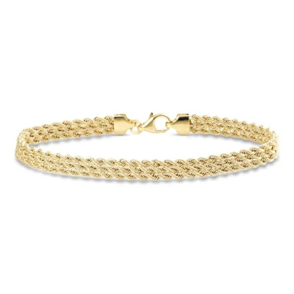 This Italian-made bracelet features a beautiful multi-strand rope chain design, perfect for layering or wearing alone. The 7.5-inch bracelet is fashioned in 14K yellow gold and secures with a lobster clasp.