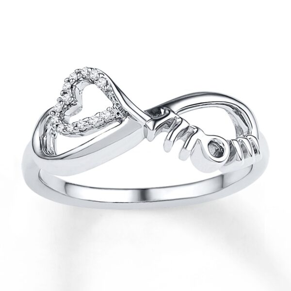 A mother’s love is infinite in this fashionable sterling silver ring for her. An infinity symbol features a heart decorated in diamonds and the word "mom" opposite. The ring has a total diamond weight of 1/20 carat.