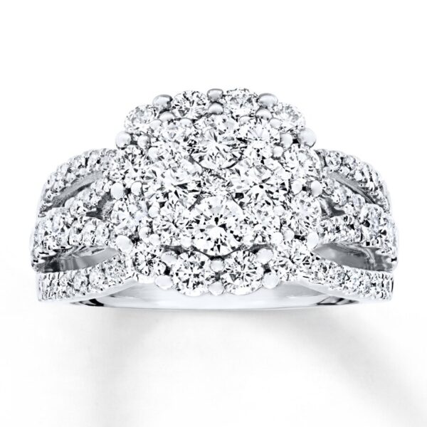 A bouquet of round diamonds blooms at the center of this fabulous engagement ring for her, styled in 14K white gold. Ribbons of round diamonds weave along the band, bringing the total diamond weight to 2 carats. Available online while supplies last. Previously Owned Treasures are not eligible for in-store pickup. Previously Owned Treasures may only be shipped either to your home address or to an alternate address.